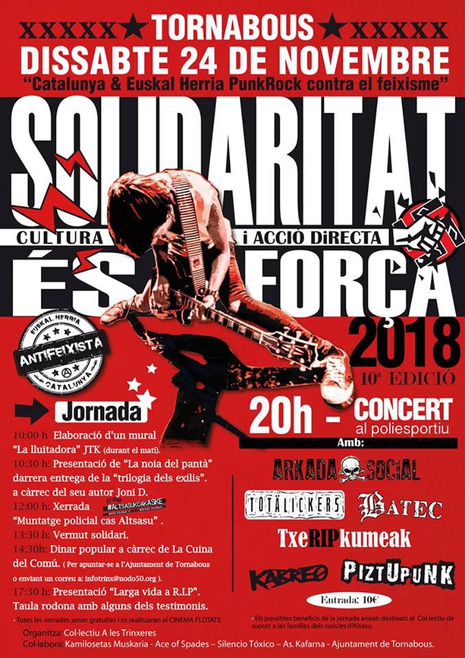 Bajo el lema Catalunya & Euskal Herria PunkRock contra el feixisme se va a desarrollar la décima edición del Solidaritat Es Força. Concierto solidario en Torbabous, Lleida, en el que se van a recaudar fondos para las familias de los jóvenes de Altsasu que actualmente se encuentran en prisión. Los datos que conocemos son los siguientes: