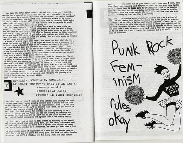 Número #2 del zine Bikini Kill, de 1991. Esta imagen muy reproducida de una animadora con pompones y un suéter Bikini Kill captura la estética de Riot Grrrl.