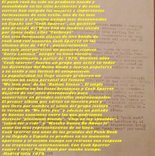 Hoja interior en la edición española del primer disco de Cock Sparrer (Decca, 1978)