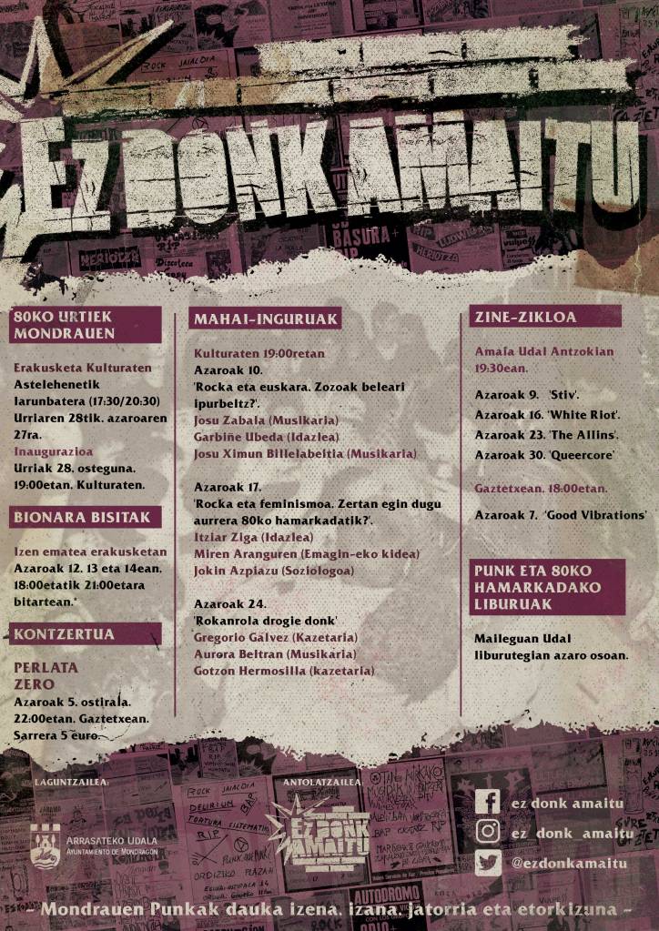 Nos han enviado información sobre unas jornadas que organiza el colectivo Ez Donk Amaitu («No ha terminado») en Mondragón/Arrasate durante las próximas semanas. «Pensamos que el punk en Mondra tiene pasado, presente y futuro. El punk como cada cual lo entienda: estilo, actitud, activismo… Nos hemos juntado unas diez personas de muy diferentes edades y vivencias a las que nos une eso, el punk. Queremos romper con la mitificación excesiva y desconocimiento sobre los 80. Queremos mostrar cómo fue esa década, con lo bueno y con lo malo. Estuvo bien, pero pensamos que hay que aprender de ahí, y siempre tirar para adelante. Además, como juego de palabras, Ez Dok Amairu fue un movimiento que surgió en los 60 en Euskal Herria para reivindicar la música y el teatro en euskera«.
